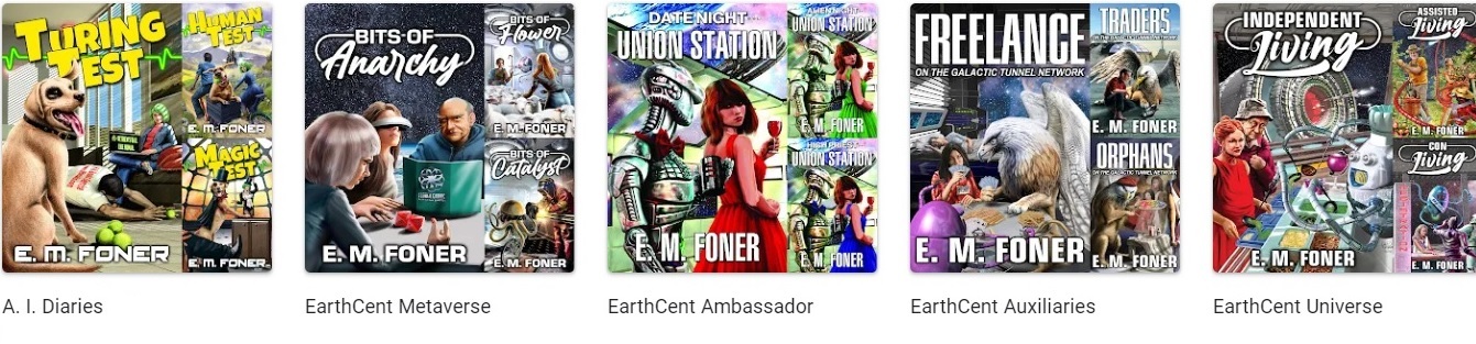 E. M. Foner on Writing SciFi - Foner Books WebsiteThe EarthCent series features a galaxy managed by ancient artificial intelligence. My new series, Under the Influencers, features a galaxy in which superintelligence is banned, as is combining any level of artificial intelligence with robots. EarthCent also takes advantage of the hand-waving tunnel network for point-to-point communications across interstellar distances. Under the Influencers has its own interstellar workaround for travel, providing the ship is massive enough, but communications must be hand carried by the intergalactic mail. It creates quite a few challenges for financial transactions and gambling.